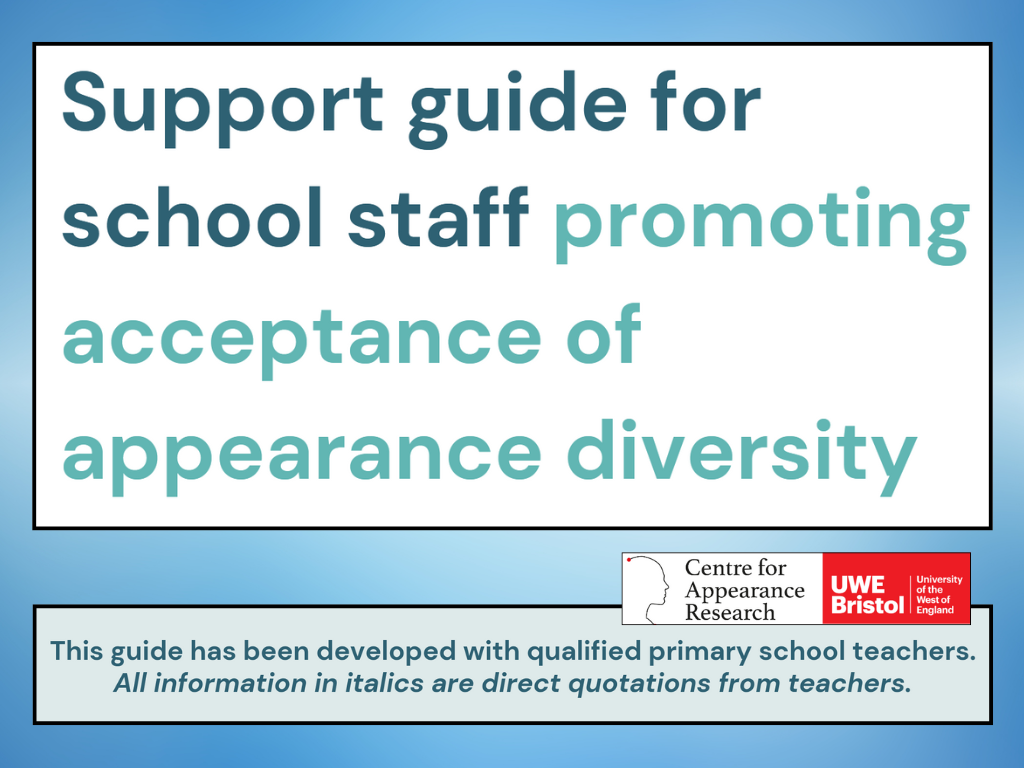 Teachers play a vital role in shaping how children feel about themselves and their peers. For pupils with a visible difference, the words teachers use can have a lasting impact on confidence, inclusion, and wellbeing. This guide from Centre for Appearance Research's new website Visible Difference Support Hub offers practical advice on language, helping teachers to communicate in ways that are respectful, supportive, and empowering. It highlights common pitfalls to avoid, provides positive alternatives, and gives strategies for fostering a classroom culture where difference is understood and valued.