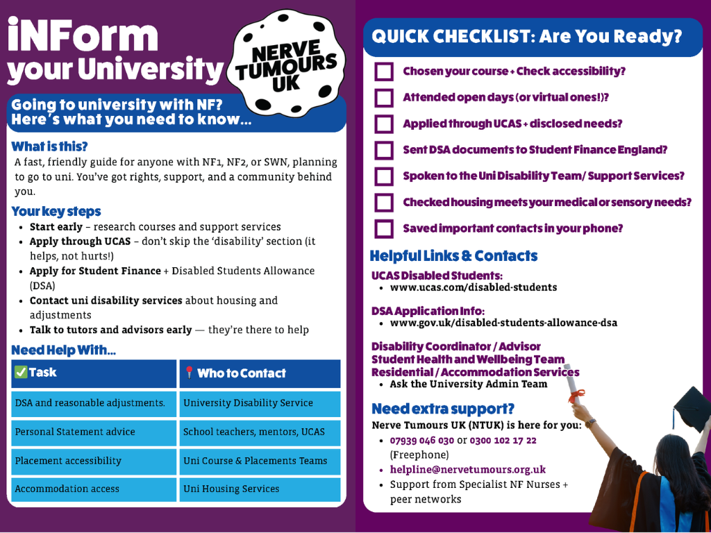 Starting university can be a whirlwind, especially when you’re also managing NF (NF1, NF2, or SWN). That’s why we’ve created this handy A5 size checklist: a brief, friendly reminder of what to think about and who to contact as you prepare for uni life.