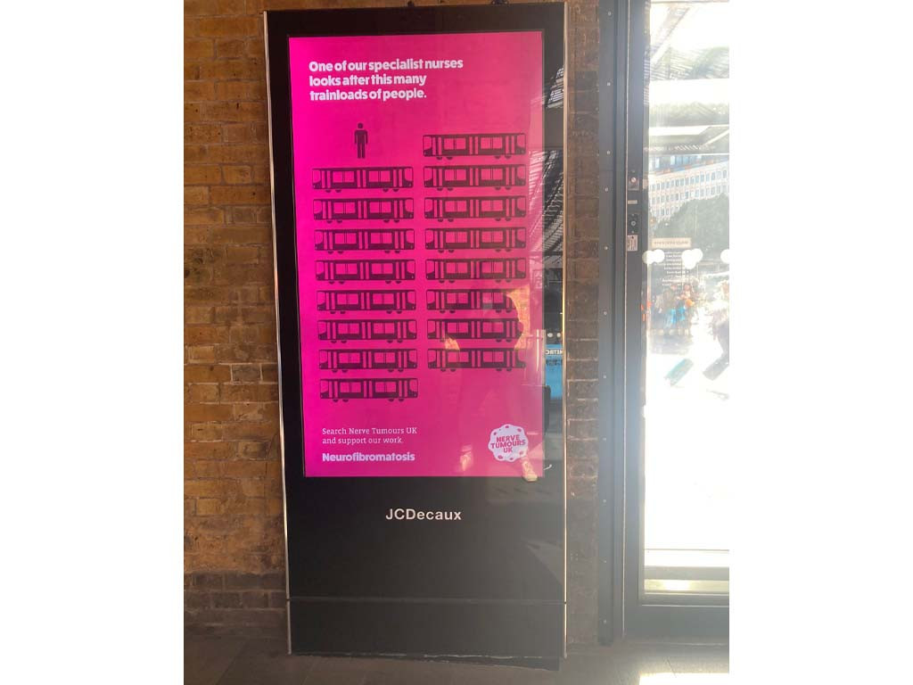 – RBH"It is shocking to learn that each of Nerve Tumours UK’s 12 Specialist Nurses looks after around 2,000 people with Neurofibromatosis. But how do you help members of the public comprehend the scale of that responsibility? We decided that the best way to do so was by graphically representing it. We are proud to support Nerve Tumours UK, and this is our second campaign promoting their efforts. Our hope is that this campaign goes a long way in raising their profile."