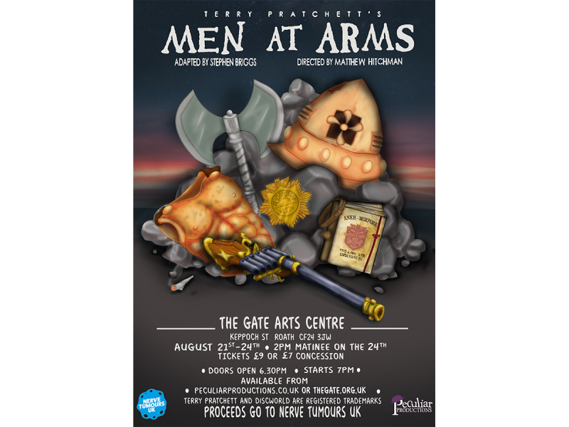 Peculiar Productions is an amateur theatre company which puts on very accomplished productions, principally of Terry Pratchett adaptations. This year’s show brings to life on stage Terry Pratchett’s classic comedy-fantasy thriller, Men at Arms. The company gives all the proceeds from their shows to charity, and this year has chosen Nerve Tumours UK as the beneficiary.