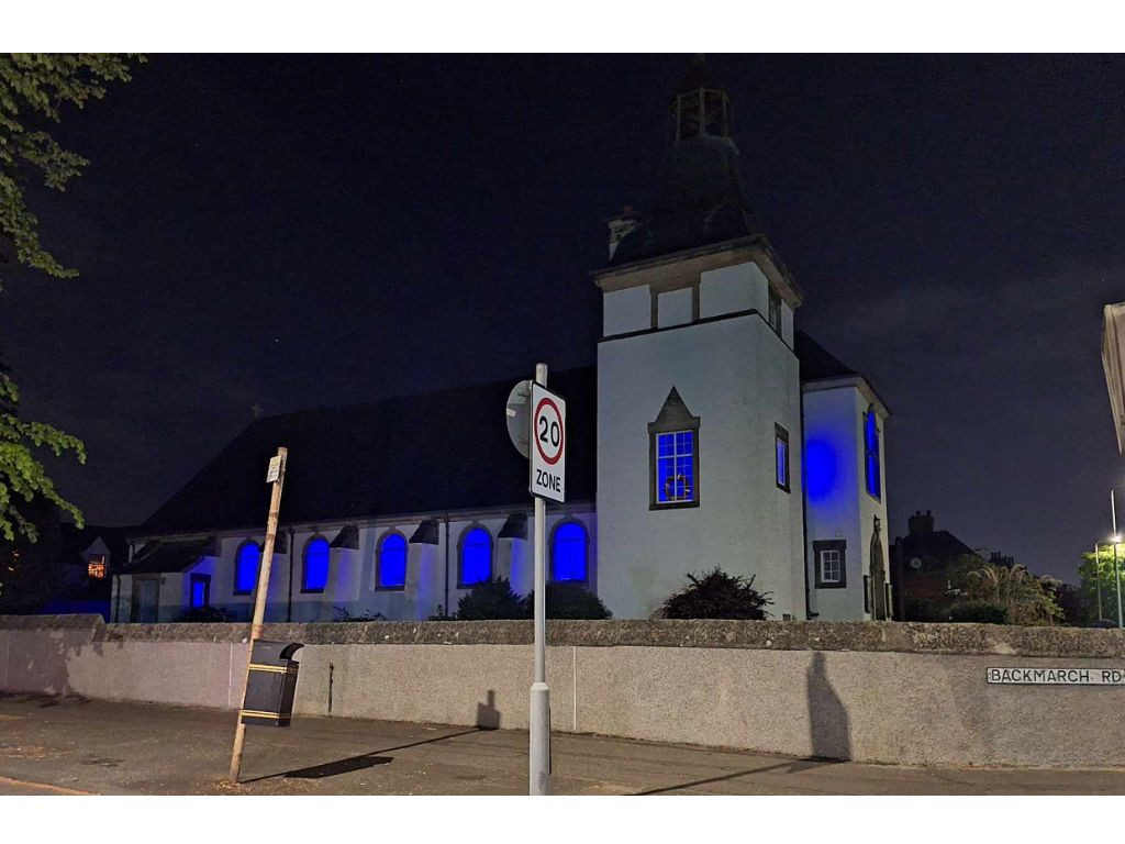Rosyth Parish Church, Dalgety, lit up on 17 May