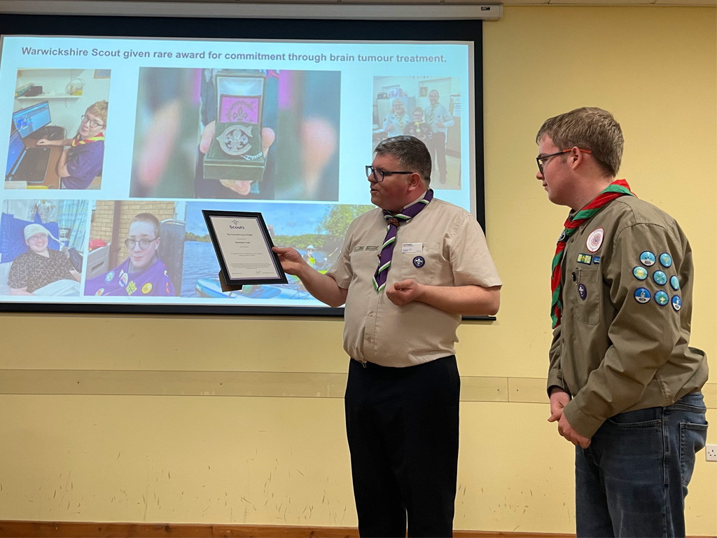 Warwickshire Scout given rare award for commitment through brain tumour treatment.