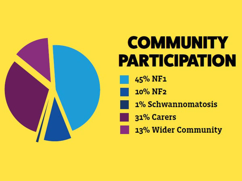 Of the replies, 45% represented the NF1 community, 10% represented the NF2 community and 1%, the Schwannomatosis community. Carers made up 31% of replies, whilst a further 13% of feedback came from the wider associated community.
