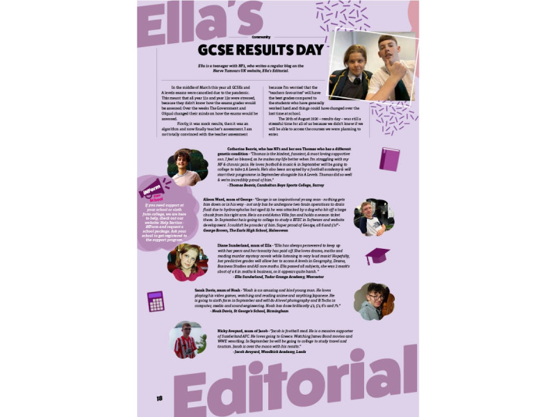 Mum, Catherine: Thomas is the kindest, funniest, & most loving supportive son. I feel so blessed, as he makes my life better when I'm struggling with my NF & chronic pain. He loves football & music, & in September will be going to college to take 3 A-Levels. He's also been accepted by a football academy & will start their programme in September alongside his A-Levels.