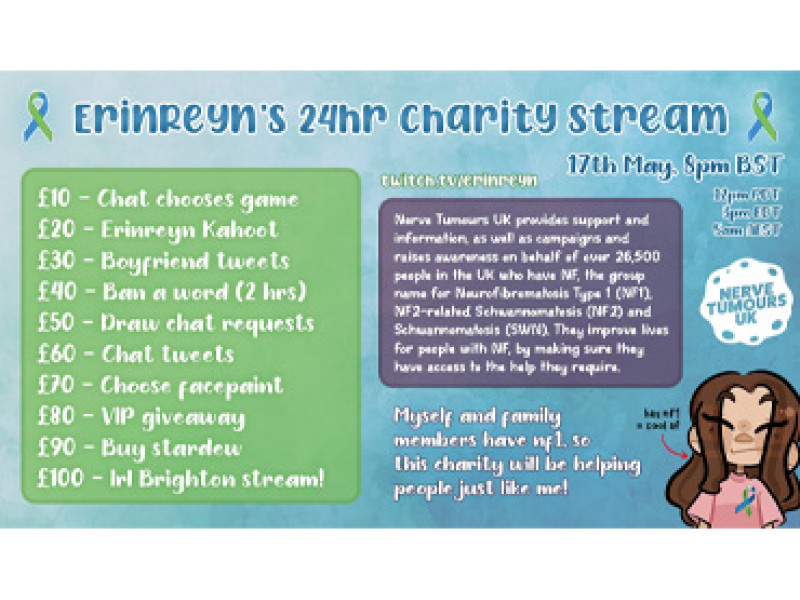 Erin has NF1 and is raising awareness with a 24 hour live charity stream to Shine A Light on NF