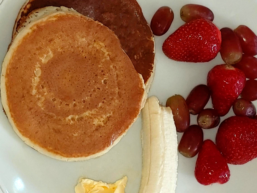 On Sunday as a treat I had American style pancakes with grapes, strawberries and a banana for breakfast. It was very tasty and delicious as it filled me up.