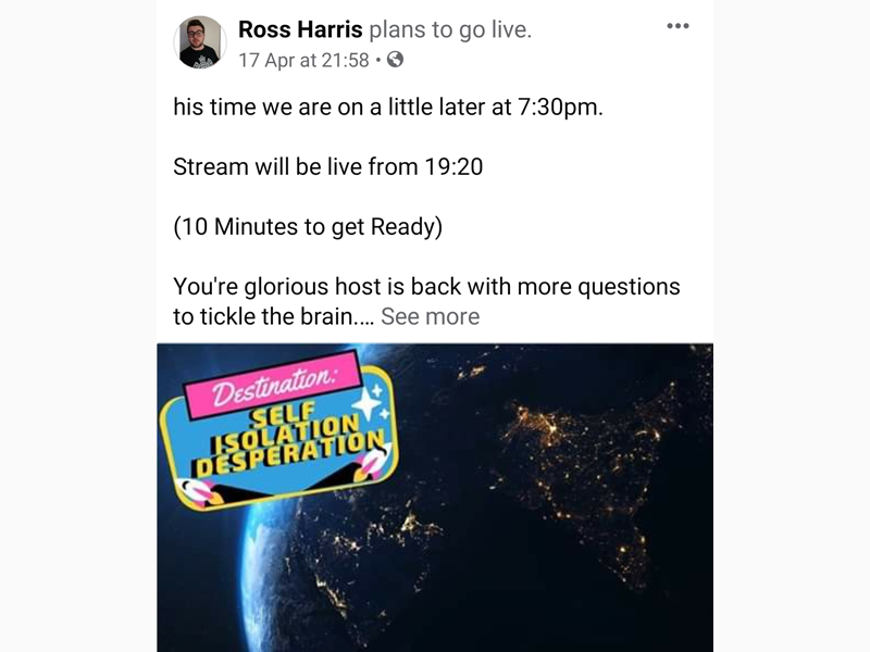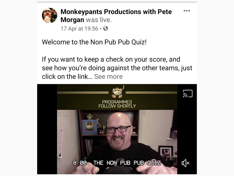 On Fridays my family do two ‘Non-Pub Pub quizzes’. One is organized by my cousin Ross Harris, who is an actor (you can search him up on Facebook). The second one is organised by an ex local radio presenter called Pete Morgan, If you want to join in search his Monkeypants Productions page on FB. This gives us something to do as a family and breaks up the boredom.